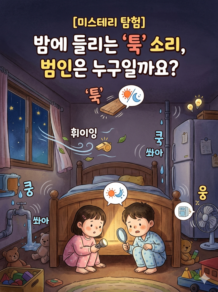 어린이 탐정 여러분, 환영해요! 깜깜한 밤만 되면 들리는 수상한 소리들의 비밀을 파헤치러 떠나볼까요? 낮에는 아무렇지도 않던 소리들이 밤만 되면 왜 이렇게 크게 들리는 걸까요? 무서운 상상을 하기 전에, 우리 함께 밤의 미스테리를 해결하는 탐정이 되어봐요!