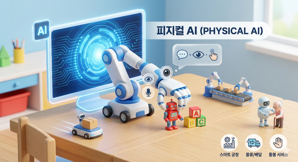 ์ง๊ธ๊น์ง ์ฐ๋ฆฌ๊ฐ ๋ง๋ AI๋ ์ฃผ๋ก ์ค๋งํธํฐ์ด๋ ์ปดํจํฐ ํ๋ฉด ์์ ์์์ด์. ๊ถ๊ธํ ๊ฑธ ๋ฌผ์ด๋ณด๋ฉด ๋ตํด์ฃผ๊ณ , ๋ฉ์ง ๊ทธ๋ฆผ์ ๊ทธ๋ ค์ฃผ๊ธฐ๋ ํ์ฃ . ๊ทธ๋ฐ๋ฐ ์ด์ AI๊ฐ ํ๋ฉด ๋ฐ์ผ๋ก ๊ฑธ์ด ๋์ ‘๋ชธ’์ ๊ฐ๊ธฐ ์์ํ๋์. ์ด๊ฑธ ๋ฐ๋ก ‘ํผ์ง์ปฌ AI(Physical AI)’๋ผ๊ณ ๋ถ๋ฌ์!